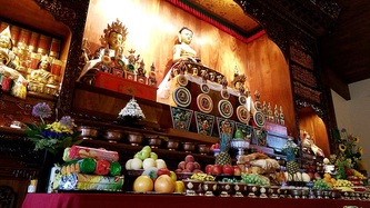 Please wear socks and take off your shoes prior to entering the main hall. Note: You can borrow a "uniform" (black robe) to wear if you'd like to participate fully in the chanting, and are welcome to bow (prostrate) and follow along in the walking meditation, or just sit in the back.